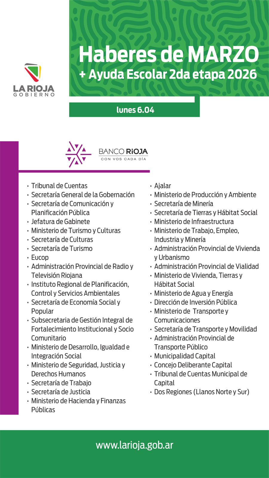 Según se informó oficialmente, el pago comenzará el próximo lunes 6 de abril, a través del Banco Rioja, alcanzando a trabajadores de la administración pública provincial, organismos descentralizados y municipios.